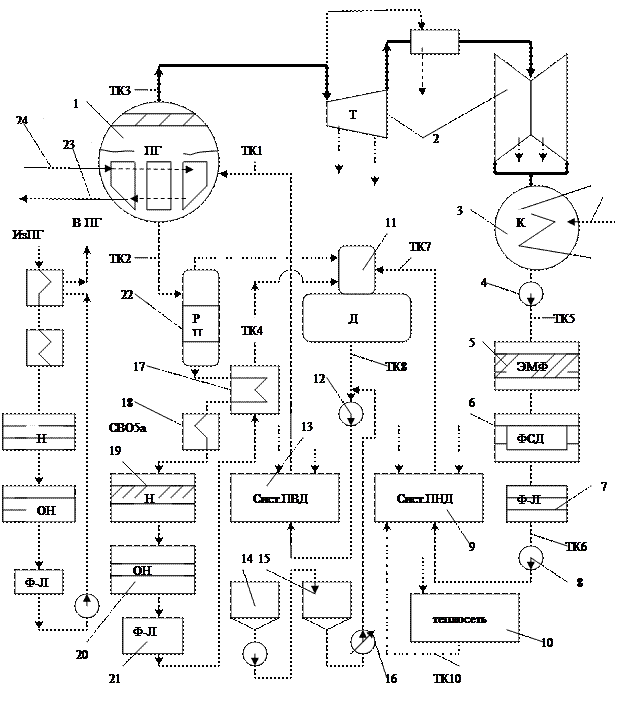 Рис. 2.2. Схема ВХР второго контура АЭС с ВВЭР 1- парогенератор, 2- турбина, 3 –конденсатор, 4 –КЭН-1, 5 – электромагнитный фильтр БОУ, 6 – фильтр смешанного действия БОУ, 7 – фильтр ловушка, 2 – КЭН -2,9 – система подогревателей низкого давления, 10 – подогреватели теплосети, 11 – деаэратор, 12 – питательный насос, 13 – система подогревателей высокого давления, 14 – бак приготовления раствора, 15 – расходный бак (бак-дозатор), 16 –насос –дозатор, 17 – регенеративный теплообменник продувки, 18 – доохладитель продувки, 19- катионитный фильтр продувки, 20 –анионитовый фильтр продувки, 21 – фильтр –ловушка, 22 – расширитель-продувки, 23 –к реактору, 24-от реактора