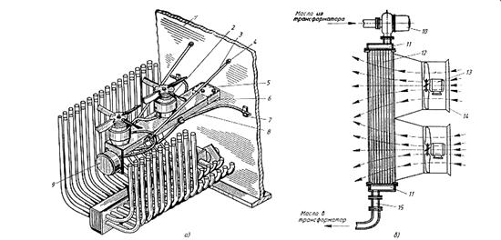 Рис. 7.6 Трансформатор устанавливается на фундамент таким образом, чтобы его крышка имела уклон 1...1,5%, обеспечивающий беспрепятственное поступление газа из трансформатора в маслопровод, идущий к газовому реле. Для закрытой установки трансформаторов используется либо отдельное здание, либо трансформаторные камеры — помещения в общем здании энергетического объекта. Камера снабжается индивидуальной вентиляционной системой, не связанной с другими вентиляционными системами здания. Система рассчитывается на отвод тепла, чтобы разность температур на входе и выходе из помещения не превышала 15°С. Проверяют влагосодержание образцов изоляции, которые закладываются в трансформаторы мощностью более 80 МВ·А. Влагосодержание образца изоляции толщиной 3 мм должно быть не более 1 %. Установка трансформаторов. Трансформаторы могут устанавливаться на каретке с катками или на фундамент. Для подъема и установки трансформатора на место могут использоваться краны, лебедки, полиспасты, домкраты и другие средства. Для обеспечения надежной работы газового реле трансформаторы должны устанавливаться так, чтобы крышка имела подъем к реле не менее 1 —1,5%. После установки к трансформатору присоединяют шины, кабели или провода, а также выполняют его заземление. Заливка и доливка маслом. В трансформаторы, прибывшие с завода, заливают только свежее масло, показатели качества которого соответствуют требованиям ПУЭ. Перед окончательной сборкой трансформаторов, прибывших без масла, бак расширителя и все элементы системы охлаждения промывают сухим, горячим трансформаторным маслом. Доливка масла в трансформаторы, прибывшие с маслом без расширителя, производят через расширитель. Маслопроводы для заливки очищают и промывают маслом, а на них устанавливают маслоочисттельные установки. Скорость доливки не должна превышать 3 т/ч. Температура доливаемого масла не должна отличаться от температуры масла в трансформаторе более чем на 5° С. Масло заливают непрерывно, пока не закроются все обмотки или изоляционные детали, расположенные выше ярма. Уровень масла устанавливают в зависимости от его температуры по имеющимся на указателе уровня контрольным меткам, для этого маслоуказатель должен быть доступен для осмотра и иметь видимые три контрольные точки, соответствующие уровню масла при 15° С и предельных температурах. После заливки открывают воздухоспускные пробки и выпускают воздух. Если после 12 ч отстоя уровень масла понизится ниже допустимого, то масло доливают. После окончания доливки и отстоя проверяют герметичность уплотнений трансформатора избыточным давлением столба масла и отбирают пробу масла для анализа. Монтаж охлаждающей системы. При монтаже охлаждающей системы типа Д (охлаждение масляное с дутьем) на баке устанавливают кронштейны, электродвигатели с вентиляторами (рис. 6.7, где 1 — стенка бака; 2 — двигатель; 3 — растяжка; 4 — бобышка; 5 — кронштейн; 6 — скоба; 7 — крепление кабеля; 8 — трехжильный кабель; 9 — распределительная коробка; 10 — электронасос; // — камеры для масла; 12 — калорифер; 13 — вентилятор; 14 — 22 диффузор; 15 — струйное реле), монтируют электрическую схему; после установки радиаторов открывают радиаторные краны.