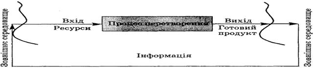 Згідно із системним підходом до управління кожна організація — це відкрита система, цілісність і життєздатність якої забезпечується завдяки елементам, з яких вона формується. Сукупність цих елементів становить внутрішнє середовище організації. Його проектування і створення відбувається з огляду на специфіку діяльності організації, кола споживачів, ринкової кон'юнктури, умов господарювання тощо. Система менеджменту при формуванні внутрішнього середовища організації має забезпечити відповідність характеристик його найважливіших складових умовам зовнішнього середовища, в яких організація функціонує. Внутрішнє середовище організації формується керівниками відповідно до їх уявлень про те, які саме елементи забезпечать її ефективне функціонування і розвиток. Цим зумовлене існування різних підходів до структурування внутрішнього середовища організацій. Найчастіше в ньому виділяють п'ять складових: цілі, структура, технологія, завдання і персонал, який виконує ці завдання з допомогою відповідної технології. Деякі представники сучасної російської школи управління вважають, що внутрішнє середовище — це структура організації, її ресурси та культура; інші до внутрішнього середовища відносять структуру, рівень розподілу праці та організаційні комунікації, а також кадровий склад організації, трудові й технологічні процеси, що використовують для перетворення ресурсів на необхідний суспільству продукт. На рис. 7.1 наведено схематичне зображення організації як відкритої системи. Вона забезпечує свою життєздатність перетворенням ресурсів, які отримує із зовнішнього середовища, на готовий продукт (вироби, послуги, ідеї) для суб'єктів зовнішнього середовища.