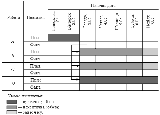 Цей же графік робіт можна подати у вигляді балочної діаграми, або, як її ще називають, діаграми Гантта, за ім’ям німецького інженера, який вперше запропонував цей інструмент календарного планування проектів на початку ХХ століття. Як бачимо з рис. 6.22, діаграма Гантта є наочним джерелом такої проектної інформації: · які роботи є критичними, а які – некритичними; · який запас часу мають некритичні роботи; · коли мають розпочинатися і завершуватися за планом проектні роботи; · якими є логічні зв’язки між роботами; · яким є фактичне виконання робіт на певну дату.