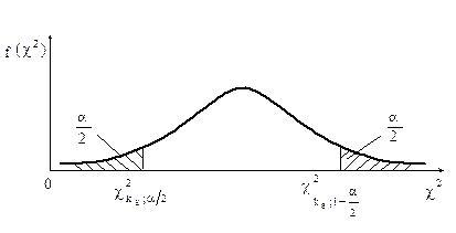де Г(∙) – відома гама-функція. Інтегральна функція ‑ табульована (додаток 8). Вхідними даними таблиць, які складені, є рівень значущості (або довірча ймовірність ) і число степенів вільності . Для рівня значущості знаходять нижню і для рівня значущості - верхню границі критичної області значень (рис.3.6).