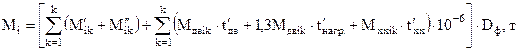 где Мдвik и Мххik - удельные выбросы загрязняющих веществ дорожными машинами, соответственно, при движении без нагрузки и при работе на холостом ходу (табл.2.3 и 2.4 в [35]); 1,3Мдвik - удельный выброс загрязняющих веществ при движении под нагрузкой, рассчитанный исходя из того, что при увеличении нагрузки увеличивается расход топлива; Nk - наибольшее количество дорожных машин каждого k-того вида, работающих одновременно в течение 30-ти минут; k - количество учитываемых видов дорожно-строительных машин. Валовой выброс рассчитывается для каждого периода года по каждому виду ДМ по формуле: