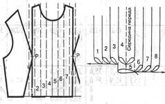 На основі пілочки з переведеними виточками наносять лінії розміщення складок. Кількість ліній визначається кількістю складок по моделі. По наміченим лініям основу пілочки розрізають та розводять рівномірно на кожній ділянці на подвійну ширину складки.