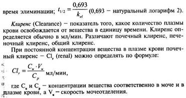 Большинство лекарственных веществ выводится из организма через почки в неизмененном виде или в виде продуктов биотрансформации. В почечные канальцы вещества могут поступать при фильтрации плазмы крови в почечных клубочках. Многие вещества секретируются в просвет проксимальных канальцев. Транспортные системы, которые обеспечивают эту секрецию, малоспецифичны, поэтому разные вещества могут конкурировать за связывание с транспортными системами. При этом одно вещество может задерживать секрецию другого вещества и таким образом задерживать его выведение из организма. Например, хинидин замедляет секрецию дигоксина, концентрация дигоксина в плазме крови повышается, возможно проявление токсического действия дигоксина (аритмии и др.). Липофильные неполярные вещества в канальцах подвергаются обратному всасыванию (реабсорбции) путем пассивной диффузии. Гидрофильные полярные соединения мало реабсорбируются и выводятся почками. Выведение (экскреция) слабых электролитов прямо пропорционально степени их ионизации (ионизированные соединения мало реабсорбируются). Поэтому для ускоренного выведения кислых соединений (например, производных барбитуровой кислоты, салицилатов) реакцию мочи следует изменять в щелочную сторону, а для выведения оснований — в кислую. Кроме того, лекарственные вещества могут выделяться через желудочно-кишечный тракт (выделение с желчью), с секретами потовых, слюнных, бронхиальных и других желез. Летучие лекарственные вещества выделяются из организма через легкие с выдыхаемым воздухом. У женщин в период кормления грудью лекарственные вещества могут выделяться молочными железами и с молоком попадать в организм ребенка. Поэтому кормящим матерям не следует назначать лекарства, которые могут неблагоприятно воздействовать на ребенка. Биотрансформация и экскреция лекарственных веществ объединяются термином «элиминация». Для характеристики элиминации используют константу элиминации — ке1 (ке) и период полуэлиминации - t1/2. Константа элиминации показывает, какая часть вещества элиминируется в единицу времени. Например, внутривенно введено вещество А в дозе 10 мг; ке1 = 0,1/ч. Через 1 ч в плазме крови останется 9 мг, через 2 ч - 8,1 мг. Период полуэлиминации — t1/2 — время, за которое концентрация вещества в плазме крови снижается наполовину. В основное время элиминации t1/2 не зависит от дозы вещества и одинаков в разное