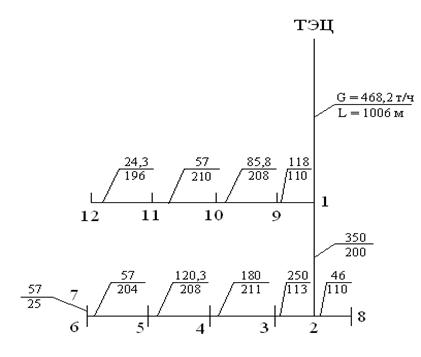 Для проведения гидравлического расчета составляется расчетная схема сети, на которой показывается источник теплоснабжения, трасса тепловой сети и подсоединяемые к ней ЦТП или узловые камеры кварталов. Трассу разбивают на расчетные участки, указывая на каждом номер, длину и расход теплоносителя.