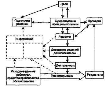 Рис. 2.13. Принцип действия процесса управления в организации: сплошная линия - влияние (ход процесса), штриховая - поступление информации Управленческий труд выделился в особую категорию общественного труда. Вследствие этого работа по управлению отделяется от неуправленческой работы, поскольку управление как вид деятельности присуще всякому совместному труду. В широком понимании управление - это процесс планирования, организации, мотивации и контроля, необходимый для того, чтобы сформировать и достичь целей организации. Т.е. управленческий труд - это вид общественного труда основной задачей которого является обеспечение целенаправленной, скоординированной деятельности как отдельных участников совместного трудового процесса, так и трудовых коллективов в целом. Можно выделить специфические особенности управленческого труда: 1) умственный труд работников аппарата управления, со организационно-административная и воспитательная работа (прием и передача информации, доведение решений до исполнителей, контроль исполнения); аналитическая и конструктивная работы (восприятие информации и подготовка соответствующих решений); информационно-техническая работа (документационные, учебные, вычислительные и формально-логические операции); 2) участие в создании материальных благ не прямо, а опос 3) предмет труда - информация; 4) средства труда - организационная и вычислительная техника; 5) результат труда - управленческие решения. В зависимости от функциональной роли в процессе управления организацией выделяют: руководителей, специалистов и вспомогательный персонал. Труд руководителей представляет собой наиболее высокую ступень управления. Они принимают решения по важнейшим вопросам деятельности организации, направляют и координируют работу низших звеньев. Специалисты выполняют функции по подготовке и реализации управленческих решений. В их деятельности сочетаются функции управления и исполнения. Вспомогательный персонал (технические исполнители) осуществляет информационное обслуживание аппарата управления. Лиц, занятых управленческой деятельностью, классифицируют и по другим признакам, в частности по составу и профилю возглавляемых ими коллективов, уровню и месту, занимаемому в системе управления. По данному признаку руководители могут быть высшего, среднего и низшего уровней.