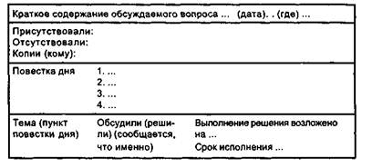 Рис. 13.4. Модель ведения протокола совещания Подведение итогов и принятие решения. Завершающий этап организации проведения совещания - это принятие решения и проведение его в жизнь. Следует иметь в виду, что решение на совещании принимается всеми вместе и каждым в отдельности. От того, насколько участнику совещания удалось включить свои идеи и соображения в общее решение, зависит его эффективность. По сути на этом этапе речь идет о том, чтобы пояснить, кем и в какие сроки должен быть выполнен определенный объем работ. Определяется, в какой форме будут подведены итоги (рассылка протокола или его части (выписка из протокола)), принимается решение о широте информирования (весь коллектив или его часть). Решения могут вырабатываться двумя путями: 1) специально избранная комиссия по подготовке решения 2) председатель собрания подводит итоги обсуждения и После принятия решения определяется лицо (группа лиц), осуществляющих его исполнение и контроль за исполнением. Эффективность деловых совещаний. Искусство управления и талант менеджера определяются умением максимально эффективно проводить деловые совещания. В этой связи каждый менеджер должен уметь рассчитать цену совещания. Для расчета необходимо знать количество участников совещания, его продолжительность и часовую тарифную ставку каждого участника. Формула расчета цены совещания имеет следующий вид: