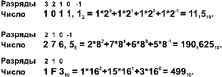 За основание системы можно принять любое натуральное число — два, три, четыре и т.д. Следовательно, возможно бесчисленное множество позиционных систем: двоичная, троичная, четверичная и т.д. Запись чисел в каждой из систем счисления с основанием q означает сокращенную запись выражения an-1 qn-1 + an-2 qn-2 +... + a1 q1 + a0 q0 + a-1 q-1 +... + a-m q-m,