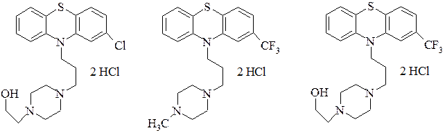 Психотропні лікарські засоби Співвідношення між силою збуджувального й пригнічувального процесів у мозку є матеріальною основою психічної діяльності людини. Психофармакологічні засоби регулюють це співвідношення під час його розладів. Вони впливають на стан людського мислення при психічних розладах різного характеру, знімають відчуття страху, знижують агресивність, поліпшують настрій, сприяють діяльності мозку. Психофармакологічні засоби становлять одну з найчисельніших груп лікувальних препаратів. При їх класифікації насамперед беруть до уваги психо-фармакологічну дію. Нейролептики – це препарати, які послаблюють деякі з основних симптомів тяжкої психічної недуги – шизофренії. Основні фармакологічні властивості нейролептиків пов’язані з їх антипсихотичною активністю: пригнічення марення, галюцинацій, інших паталогічних синдромів хворих на шизофренію. Нейролептики діють на адренергічні, дофамінергічні, сератонінергічні, ГАМК-ергічні, холінергічні нейромедіаторні системи мозку. Відомо, що накопичення дофаміну – основна причина виникнення шизофренії. Вплив на дофамінові рецептори торкається і норадренергічних систем, оскільки дофамін є попередником в біосинтезі норадреналіну. З відомих нейролептиків такі як аміназин, левопромазин впливають на норадренергічні, а фторфеназин, галоперідол, сульпірид – на дофамінергічні рецептори. За хімічним походженням нейролептики можна поділити на наступні групи: 1. Похідні фентіазину (аміназин, пропазин, лівомепромазин, етаперазин, трифтазин, фторфеназин):