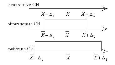 Поверка выполняется согласно поверочной схемы – документа, в котором указывается последовательность проведения поверки, используемые приборы и методы измерения. Для поверки рабочих средств измерения применяют образцовые средства измерений. Это приборы, имеющие характеристики точности на порядок выше рабочих. Как правило, образцовые средства измерений, - лабораторные приборы стационарные, агрегатированные (составленные из нескольких приборов). Стоимость образцовых средств измерений, значительно превышает стоимость рабочих средств измерения, поэтому их не применяют для получения количественной информации об объекте. Образцовые средства измерения могут иметь различную точность (I или II порядка). Соответствующую нижним, т.е. имеющие большую погрешность могут использоваться для поверки. Эталонные средства измерений, как правило, в службах государственного стандарта и ведомствах не имеющих их. Таким образом служба контроля за точностью средств измерения охватывает как производство средств измерения, так и эксплуатацию. Основная задача этой службы – получение достоверной информации об исследуемом объекте.