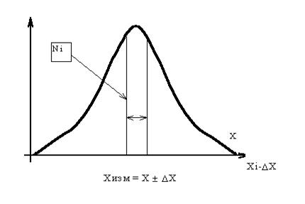 Поскольку Х изм можно представить через сумму среднего (истинного) значения X и погрешности измерения, то графически выборку определенного числа измерений k можно представить обобщенным графиком, на котором ордината Ni показывает число (количество) измеренных значений с величиной (X± DX). Выборка дает какое-то произвольное распределение. Для большинства распределения по краям убывают. Поэтому принято описывать, присваивать реальным распределениям различные законы. Наиболее часто используется нормальный закон. На графике можно представить количество измеренных величин, попадающих в определенный интервал. С уменьшением гистограмма по форме стремится к математическому представлению закона распределения. На гистограмме по ординате частость, т.е. количество опытов с одинаковыми результатами. Кривая, описывающая закон распределения - пронормированная величина. Каждое ее значение разделено на число выборок (опытов). Поэтому площадь под кривой равна интегралу.