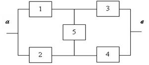 Рис. 2.3 Мостиковая схема соединения элементов Метод перебора состояний. Расчету надежности любой системы независимо от используемого метода предшествует определение двух непересекающихся множеств состояний элементов, соответствующих работоспособному и неработоспособному состояниям системы. Каждое из этих состояний характеризуется набором элементов, находящихся в работоспособном и неработоспособном состояниях. Поскольку при независимых отказах вероятность каждого из состояний определяется произведением вероятностей нахождения элементов в соответствующих состояниях, то при числе состояний, равном т, вероятность работоспособного состояния системы