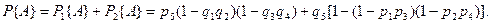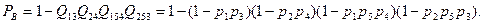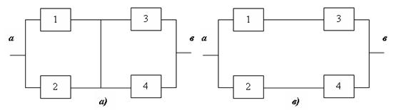 При определении минимальных сечений осуществляется подбор минимального числа элементов, перевод которых из работоспособного состояния в неработоспособное вызывает отказ системы. При правильном подборе элементов сечения возвращение любого из элементов в работоспособное состояние восстанавливает работоспособное состояние системы. Поскольку отказ каждого из сечений вызывает отказ системы, то первые соединяются последовательно. В пределах каждого сечения элементы соединяются параллельно, так как для работы системы достаточно наличия работоспособного состояния любого из элементов сечения. Схема минимальных сечений для мостиковой схемы приведена на рис. 2.6. Поскольку один и тот же элемент включается в два сечения, то полученная оценка является оценкой снизу: