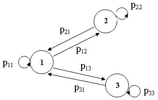Надежность таких систем описывается системой алгебраических уравнений, число которых соответствует числу возможных состояний системы. Для их составления используется ориентированный граф состояний, вершины которого соответствуют возможным состояниям системы, а ребра характеризуют направление и вероятность перехода из одного состояния в другое. В качестве примера проанализируем надежность системы защиты, которая может находиться в трех состояниях: работоспособном, ложного срабатывания и несрабатывания, обозначенных на рис. 2.7 соответственно цифрами 1, 2, 3. За интервал времени Вероятность нахождения системы в любом из состояний после i интервалов времени определяется следующей системой алгебраических уравнений: