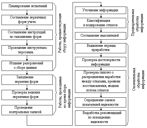 Первым этапом работы является выбор плана испытаний (продолжительности испытаний, количества испытываемых систем, места их установки). Затем составляют первичные формы учета информации о надежности, которые должны содержать следующие сведения: