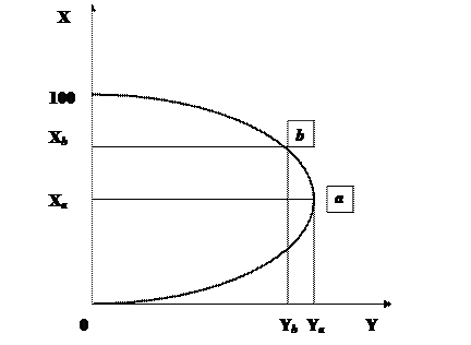 Рис. 4.2 Кривая А. Лаффера, где X – уровень налоговых ставок; X a – оптимальный размер налоговых ставок; X b – реально существующие налоговые ставки; Y – среднегодовой объем государственных доходов в результате налогообложения; Y a – максимальная величина среднегодового объема государственных доходов; Y b – налоговые поступления в государственный бюджет.