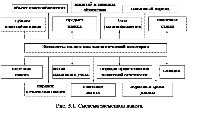 Налог как экономическое явление представляет собой системную категорию, состоящую из определенного количества взаимосвязанных элементов, каждый из которых имеет самостоятельное юридическое значение и экономический смысл. Эти элементы определяют внутреннее содержание налога как экономической категории и механизм его функционирования. В Законе Украины «О системе налогообложения» [8] выделены принципы построения системы налогообложения, среди которых есть принцип единого подхода. В нем говорится об обеспечении единого подхода к разработке налоговых законов с обязательным определением плательщика налога и сбора (обязательного платежа), объекта налогообложения, источника уплаты налога и сбора (обязательного платежа), налогового периода, ставок налога и сбора (обязательного платежа), сроков и порядка уплаты налога, оснований для предоставления налоговых льгот. То есть, этим принципом выделен элементный состав любого налога, который взимается в стране согласно законодательства. Но не сказано о том, насколько полным является этот перечень элементов налога. Выделение самостоятельных элементов налога крайне необходимо для участников налоговых отношений, ведь именно Элементы определяют конкретные характеристики любого налогового обязательства, а их законодательная формализация является непременным условием легитимности требования об уплате налога со стороны государства и существования адекватной обязанности налогоплательщика [55]. Для того чтобы налоги могли выполнять присущие им функции, все их элементы должны быть четко урегулированы законодательно. Отсутствие законодательного урегулирования элементов налога приводит к существенным проблемам, связанным с эффективностью его применения и возможностью уклонения плательщиков от налогообложения. За время существования налогов менялось их назначение и формулировки отдельных элементов, число которых постепенно увеличивалосьв связи с конкретизацией того или иного налога. В общем виде система элементов налога может быть представлена в следующем виде (рис. 5.1).
