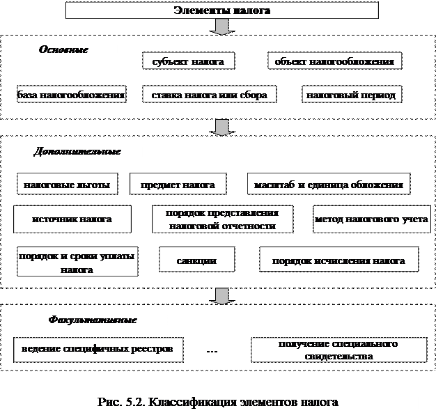 К основным (существенным) элементам относятся те, которые выражают сущность конкретного налога или сбора и должны быть в обязательном порядке установлены соответствующим законодательным актом. Без их урегулирования налог не может считаться определенным. Дополнительные элементы налога более полно характеризуют налоговое обязательство, конкретизируют основные элементы или имеют самостоятельное значение. Факультативные элементы, как правило, связаны со своеобразием и спецификой конкретного налога или сбора, поэтому их законодательное урегулирование является обязательным не для всех налогов. Вместе с тем, такая классификация представляется достаточно условной. Во-первых, отнесение элементов налога к основным или дополнительным – весьма относительно. Так, например, вряд ли можно считать определенным налог, по которому не установлен метод налогового учета. Налоговые льготы (при их наличии) непосредственно или опосредованно (через другие элементы налога) влияют на размер налогового обязательства, а, следовательно, считать этот элемент налога несущественным – весьма сомнительно. Источник уплаты налога или сбора, хотя и не связан с суммой налогового обязательства, однако имеет принципиальное значение, как для исключения двойного налогообложения, так и для механизма влияния налога на финансовое состояние плательщика. Вместе с тем, структура различных налогов – не одинакова, и в некоторых случаях отдельные элементы могут отсутствовать в механизме налогообложения. Так, например, не устанавливается продолжительность налогового (отчетного) периода для тех налогов и сборов, по которым срок уплаты определен «до или одновременно с наступлением соответствующего события» (государственная пошлина, налог с доходов физических лиц, плата за торговый патент и т.п.). В связи с этим, перечни законодательно урегулированных элементов по разным налогам могут не совпадать, однако нормальное функционирование налога требует законодательного урегулирования всех его элементов, описывающих механизм его функционирования, вне зависимости от того, к какой из перечисленных групп они относятся.