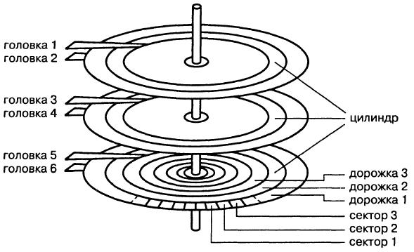 Другие функции прерывания INT 13h. Среди других функций прерывания INT 13h - форматирование дорожки, позиционирование головки на заданную дорожку диска, тестирование и предварительная установка диска, запуск диагностики контроллера и многое другое. Файловая система обращается к диску непосредственно (напрямую), и поэтому она должна знать его физическую структуру (геометрию). Магнитный диск состоит из нескольких пластин, обслуживаемых читающими/пишущими головками (рис. 8.8). Пластины разделены на дорожки, а дорожки — на сектора. Дорожки, расположенные друг над другом, образуют «цилиндр». Исторически сложилось так, что точное место на диске определяется указанием трех «координат»: цилиндра, головки и сектора.