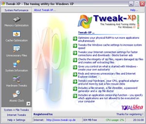 Считается одной из лучших утилит для тонкой настройки Windows XP. Удобный интерфейс, быстрая работа и широкий охват настроек, - все это характерно для нее. Программа имеет четыре раздела: улучшение общей производительности системы в целом, ускорение файловой системы, повышение скорости работы с Интернетом и настройка файлов помощи, а также настройка других программ. Tweak-XP объединяет в себе 22 важные утилиты, которые должны существенно облегчить жизнь пользователю. Это и блокирование открывающихся окон в IE, и блокирование рекламных баннеров, и Minimizer-XP, позволяющий нанести порядок в системном трее, и Trans-XP, утилита, позволяющая сделать любое окно полупрозрачным, и оптимизатор RAM, а также Atomic Clock 2001, который позволит вам видеть всегда точнейшее время. Tweak-XP позволяет оптимизировать память, кэш, работу жесткого диска. Присутствуют настройки для наиболее популярных процессоров от AMD и Intel(Pentium). Присутсвует удобная возможность запускать системные утилиты прямо из программы. Также можно отслеживать все запускаемые системой при стaрте файлы, изменять пути к стандартным папкам. А также многочисленные настройки Explorer(a) и меню "Пуск". Существует очень полезная функция - защита паролем определенных программ от запуска. Пользователь не сможет запустить программу,без введения правильного пароля (Вкладка System+File Tweaks ->Program Sensorship).
