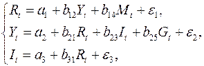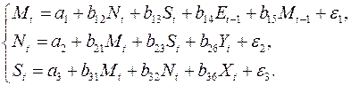 ТребуетсяD.3. Системы эконометрических уравнений Пример решения типовой задачи смотри в разделе 3. Варианты индивидуальных заданий Даны системы эконометрических уравнений. 1. Применив необходимое и достаточное условие идентификации, определите, идентифицируемо ли каждое из уравнений модели. 2. Определите метод оценки параметров модели. 3. Запишите в общем виде приведенную форму модели. Вариант 1 Модель протекционизма Сальватора (упрощенная версия):