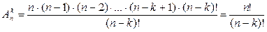 Определение. Размещениями из n элементов по k (n ³ k) называют множество комбинаций из k элементов, выбираемых из n элементов, отличающихся составом или порядком. Число размещений из n элементов по k принято обозначать Пусть необходимо найти число размещений из n элементов по k. Существует n способов выбора первого элемента. После того как он выбран, остается (n − 1) способ выбора второго элемента. Для выбора третьего элемента остается (n − 2) способа, и вообще после выбора элементов от первого до (k − 1)-го остается (n – k + 1) способов для выбора k -го элемента. Таким образом, имеем Ank = n × (n − 1) × (n − 2) ×…× (n – k + 1). (3.3) Домножив и разделив правую часть формулы (3.3) на (n − k)!, получим:
