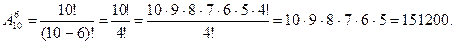 По данным «Словаря русского языка», из этих 992 комбинаций только 114 являются словами. Например, да, ад, еж, яр и т. д. Пример 3.6. Учащиеся 9 класса изучают 10 предметов. Сколькими способами можно составить расписание уроков на один день так, чтобы было 6 различных уроков? По условию задачи расписание на один день должно быть составлено из 6 различных уроков, а всего 10 предметов. Поскольку важен порядок расположения уроков в расписании (какой урок первый, какой − второй и т. д.), следовательно, необходимо найти число размещений из 10 элементов по 6. Таким образом, в соответствии с формулой (3.4) получим:
