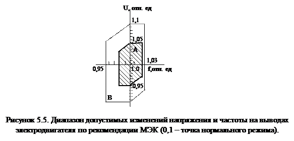 Режимы работы асинхронных двигателей в условиях эксплуатации отличаются большим разнообразием. Под нормальными режимами понимаются такие рабочие режимы работы, параметры которых находятся в пределах допустимых отклонений от номинальных значений, установленных в стандартах или технических условиях. Одно из главных условий нормальной работы электродвигателей – поддержание напряжения и частоты питающей сети в пределах установленных отклонений. Двигатели должны сохранять номинальную мощность при длительном отклонении напряжения не более В международном стандарте – Публикации МЭК 34-1 (1983) «Вращающиеся электрические машины. Номинальные данные и эксплуатационные характеристики» – установлены нормы отклонения напряжения и частоты для длительной и кратковременной работы двигателей, которые отличаются от отечественных. На рисунке 5.5 показан диапазон отклонений напряжения и частоты. В соответствии с требованием стандарта МЭК асинхронные и синхронные двигатели должны быть способны длительно развивать номинальный момент в диапазоне изменений напряжения и частоты заштрихованной зоны А (рисунок 5.5). При этом превышение температур может быть выше, чем при номинальных значениях напряжения и частоты. В незаштрихованной зоне В двигатели должны быть способны кратковременно развивать номинальный момент. Однако при этом превышения температур могут быть выше, чем в зоне А. Длительная работа двигателя в диапазоне изменения напряжения и частоты зоны В не рекомендуется. Асинхронные двигатели в процессе эксплуатации работают в установившихся режимах с различными нагрузками на валу. Режим работы определяется рабочими характеристиками, т.е. зависимостями потребляемой мощности (Р1), тока статора (I1), коэффициента полезного действия (