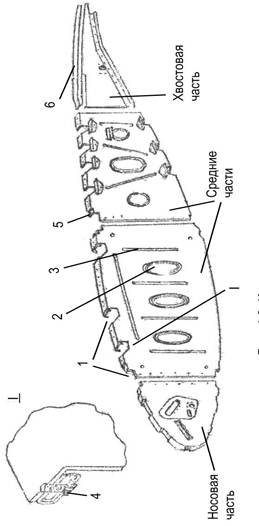 Рис. 3.3. Конструкция нервюр 1- вырезы для стрингеров; 2 – отверстия облегчения; 3 – зиговки; 4 – анкерные гайки; 5 – подсечки; 6 - пояса В зависимости от степени участия элементов крыла в восприятии изгибающего момента различают следующие конструктивно- силовые схемы: · лонжеронные, · кессонные, · и моноблочные. К лонжеронным относятся крылья, у которых изгибающий момент воспринимается лонжеронами. Крыло характеризуется тонкой обшивкой, небольшим количеством слабых стрингеров, мощными лонжеронами с развитыми поясами. Лонжеронные крылья могут быть одно-, двух- и многолонжеронными. Лонжероны устанавливаются в месте максимальной высоты профиля. В однолонжеронном крыле лонжерон располагается на расстоянии 25%-30% хорды, у двухлонжеронных крыльев: передний лонжерон располагается на расстоянии 18%-20 % хорды, а задний лонжерон - 65%-70 % хорды. Стыковка крыла с фюзеляжем осуществляется моментными или шарнирными узлами, установленными на лонжеронах. Кессонные крылья внешне не отличаются от лонжеронных и имеют те же элементы крыла. Различия заключаются в том, что в кессонном крыле обшивка участвует в восприятии изгибающего момента. Она выполняется сравнительно толстой и подкреплена большим количеством стрингеров. Пояса лонжеронов кессонного крыла по площади сечения соизмеримы со стрингерами. Лонжероны в таком крыле потеряли свою самостоятельность и превратились в продольные стенки, воспринимающие, в основном, поперечную силу. Кессонное крыло обладает большим весом в сравнении с лонжеронным и повышенной “живучестью”, поскольку при разрушении лонжерона или стрингера происходит небольшая потеря прочности и крыло продолжает работать. В моноблочных крыльях большая часть изгибающего момента воспринимается растяжением- сжатием обшивки и стрингеров и лишь незначительная часть – лонжеронами. Моноблочные крылья характеризуются толстой обшивкой, развитыми стрингерами и сравнительно слабыми поясными лонжеронами. Моноблочные крылья обладают повышенной жесткостью и “живучестью”. Стыковка крыла с фюзеляжем осуществляется с помощью специальных фитингов. Благодаря жесткой обшивке моноблочное крыло имеет гладкую поверхность.