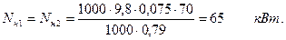 По полученным значениям Q и Нтр строится характеристика системы трубопроводов Q-Нтр. Точка пересечения А суммарной характеристики насосов SQ-H1+2 и характеристики системы трубопроводов Q-Нтр является рабочей точкой насосов. Точке А соответствует суммарная подача Q1+2 =150 л/с и суммарный напор Н1+2 =70 м. По точке 1 определяется КПД каждого насоса при их совместной работе: hн1=hн2 =0,79. Так как на графиках отсутствует кривая зависимости Nн = f(Q), то мощность каждого насоса определяется по формуле:
