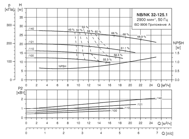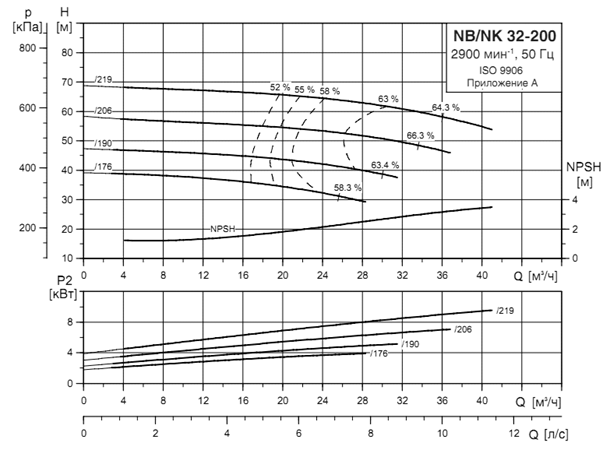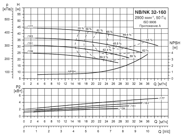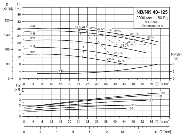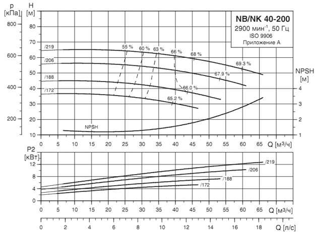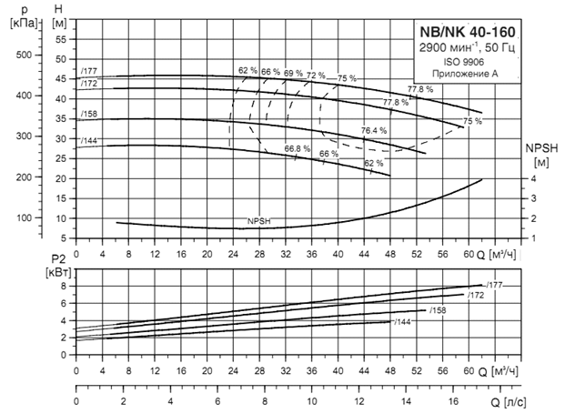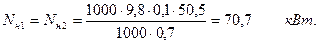 Параметры каждого насоса при их раздельной работе определяются по точке А'1,2, т. е. точке пересечения кривой насосов (Q-H)1,2 с характеристикой системы трубопроводов Q-Нтр. Точке А'1,2 соответствуют: Q'1=Q'2 =100 л/с; Н1=Н2 =50,5 м; hн1=hн2 =0,70 и мощность