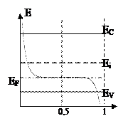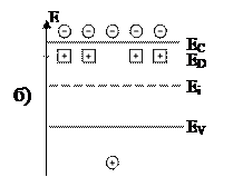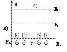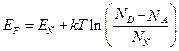 В реальном полупроводниковом материале содержатся примеси как донорного, так и акцепторного типа. В образовании свободных носителей зарядов могут участвовать только те примесные атомы, которые не скомпенсированы примесями противоположного типа. Температурная зависимость положения уровня Ферми в частично компенсированных полупроводниках в области вымораживания примеси имеет особенности, отличающие эти материалы от полупроводников с одним типом примеси. Однако указанная область не является рабочей для подавляющего большинства полупроводниковых приборов и потому далее обсуждаться не будет. В области примесной проводимости почти все примесные атомы ионизованы, однако эффективная концентрация примесей, участвующих в образовании свободных носителей, равна │ND – NA│. Установлено, что для германия и кремния 1). При ND > NA и выполнении неравенств ni << │ND – NA│ ≤ 1018 см-3 материал ведёт себя как невырожденный полупроводник n-типа с эффективной концентрацией доноров NDэф= ND – NA. Температурная зависимость положения уровня Ферми и концентрации свободных носителей соответствует графикам рис.1.3.1 и формулам (1.3.15) и (1.3.16) с точностью до замены концентрации ND на NDэф= ND – NA, т.е.