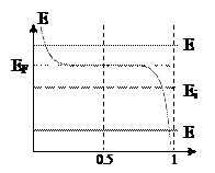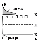 Рис.1.3.3.Энергетическая зонная диаграмма, плотность состояний вблизи дна зоны проводимости и потолка валентной зоны, функция распределения Ферми-Дирака и распределение по энергиям концентрации свободных носителей зарядов в собственном (а), донорном (б) и акцеп-