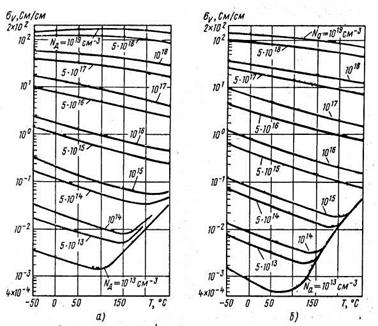 Обратимся вновь к выражению (1.5.11) для удельной проводимости полупроводника Рис.1.5.4. Температурная зависимость удельной проводимости кремния при разном уровне легирования примесью одного типа: а – кремний n-типа; б – кремний р-тпа