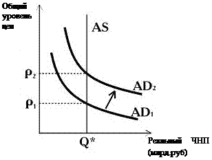 Закон совокупного предложения — при более высоком уровне цен у производителей возникают стимулы увеличения объема производства и соответственно увеличивается предложение изготовляемых товаров. График совокупного предложения имеет положительный наклон и состоит из трех частей: ˉ Горизонтальный. ˉ Промежуточный (восходящий). ˉ Вертикальный. Неценовые факторы совокупного предложения: 1. Изменение цен на ресурсы: ˉ Наличие внутренних ресурсов ˉ Цены на импортные ресурсы ˉ Господство на рынке 2. Изменение в производительности (объем производства/общие затраты) 3. Изменения правовых норм: ˉ Налоги с предприятий и субсидии ˉ Государственное регулирование Классическая модель AS. Классическая модель AS описывает поведение экономики в долгосрочном периоде. При этом анализ AS строится с учетом следующих условий: ˉ объем выпуска зависит только от количества факторов производства и технологии; ˉ изменения в факторах производства и технологии происходят медленно; ˉ экономика функционирует в условиях полной занятости и объем выпуска равен потенциальному; ˉ цены и номинальная зарплата — гибкие. В этих условиях кривая AS вертикальна на уровне выпуска при полной занятости факторов производства (рис. 19). Сдвиги AS в классической модели возможны лишь при изменении величины факторов производства или технологии. Если такие изменения отсутствуют, то кривая AS в краткосрочном периоде зафиксирована на потенциальном уровне, и любые изменения AD отражаются только на уровне цен.