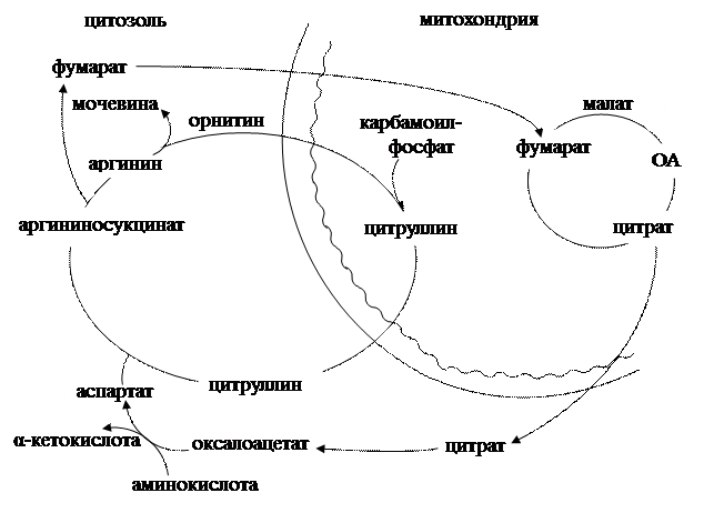 протекает в митохондриях, здесь карбамоилфосфат взаимодействует с орнитином, служащим своеобразным катализатором, вследствие чего данный процесс известен как орнитиновый цикл синтеза мочевины: