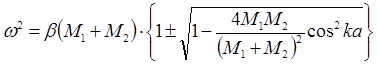 Для того, чтобы пояснить название ветвей Тест Вопрос 1. Формула для зависимости значения частот распространяющихся волн в линейной двухатомной цепочке, состоящей из двух типов частиц с различными массами M 1< M 2, от значения волнового вектора Варианты ответов: