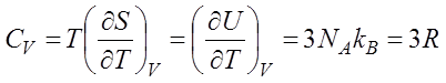 При поглощении тепловой энергии твердым телом происходит увеличение интенсивности колебания атомов, увеличение вращательной энергии молекул и увеличение энергии движения электронов. Причем основной вклад в теплоемкость дает именно первый из перечисленных эффектов (увеличение интенсивности колебания атомов), два других могут давать ощутимый вклад лишь в очень узких диапазонах температур. Внутренняя энергия твердого тела состоит из энергии, которой обладают твердые тела при абсолютном нуле температуры (энергия нулевых колебаний), и тепловой энергии. Теплоемкость- количество теплоты, которое необходимо подвести к телу, чтобы повысить его температуру на 1К, более точное определение: отношение бесконечно малого количества теплоты, полученное телом при бесконечно малом изменении его состояния, к соответствующему приращению его температуры. Соответственно можно определить теплоемкость тела при постоянном объеме CV (V = const) или постоянном давлении Cp (p = const) как производную от энергии тела по температуре. Обычно экспериментально измеряют теплоемкость при постоянном давлении Cp, однако более часто используется в теоретическом курсе физики твердого тела теплоемкость при постоянном объеме CV, причем их разница определяется выражением: Cp- CV=9a2BVT где a – линейный коэффициент теплового расширения; B – модуль объемной упругости (всестороннего сжатия), V -объем, Т – температура. Относительная разность Cp- CV (по отношению к любой из Cp или CV) невелика, и при температурах ниже комнатной данной разностью довольно часто можно пренебречь. В начале прошлого века Дюлонг и Пти экспериментально установили, что для подавляющей массы неорганических твердых тел при комнатных температурах значение теплоемкости CV
