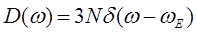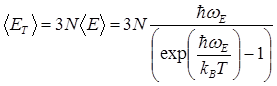 Эйнштейн сделал несколько предположений: 1. твердое тело представляет собой совокупность гармонических осцилляторов, совершающих колебания с одинаковой частотой в трех взаимно перпендикулярных направлениях; 2. энергия осцилляторов изменяется порциями (квантами) в соответствии с постулатами Планка. Т.е. в приближении Эйнштейна предполагается, что если в теле N атомов, то каждому атому ставится в соответствие 3 осциллятора, все 3 N осцилляторов в системе колеблются с одинаковыми частотами wE и функции распределения фононов по частотам При этом выражение для тепловой энергии в приближении Эйнштейна