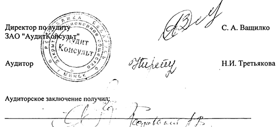 Аудиторская компания "АудитКонсульт" (лицензия АД №000087 от 9.02.2000 г., выданная Министерством финансов РБ) согласно договору №156/1 от 27.04.99 г., в лице аудитора Третьяковой И.И. (лицензия от 9.02.2000 г. АД №000990), провела аудит финансово-хозяйственной деятельности ОАО "Центроэнергомонтаж" за 1999 год с целью подтверждения достоверности бухгалтерской отчетности за указанный период. Ответственность за достоверность и полноту представленных для проведения аудита документов несет руководство предприятия. Компания ответственна за мнение о бухгалтерской отчетности, основанное на данных аудита. Аудит проведен в соответствии с общепринятыми аудиторскими стандартами, Законами Республики Беларусь "Об аудиторской деятельности", "О бухгалтерском учете и отчетности" и другими нормативными документами, включал на выборочной основе оценку используемых бухгалтерских принципов, состояния аналитического и синтетического учета, подтверждение числовых данных и пояснений, содержащихся в бухгалтерской отчетности. Результаты проведенного аудита служат основанием для принятия следующего заключения. По нашему мнению, при условии устранения замечаний, отраженных в справке, составленной по результатам аудита, представленная отчетность о финансовом положении ОАО "Центроэнергомонтаж" на 01.01.2000 г. соответствует общепринятым принципам бухгалтерского учета и отчетности, обеспечивает достоверное отражение активов и пассивов баланса.