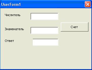 В диалоговом окне поля «Числитель» и «Знаменатель» предусмотрены для ввода данных. Пользователь вводит в них по числу. При нажатии кнопки «Счет» программа делит число, введенное в поле «Числитель» на число, введенное в поле «Знаменатель» и выводит полученный результат в поле «Ответ».