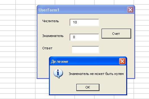 На рисунке 4 показан пример выдачи сообщения об ошибке в случае введения нуля в окно «Знаменатель».