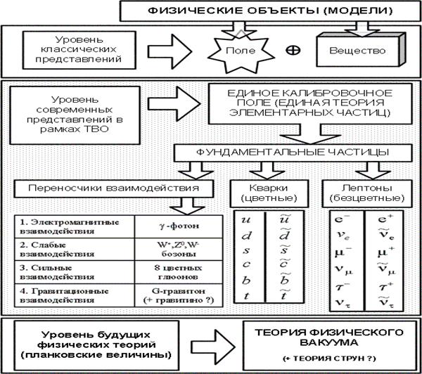 В настоящее время известные фундаментальные взаимодействия считаются проявлением единого фундаментального взаимодействия. Такой подход задает современная физическая исследовательская программа – единая теория поля. Уже имеются отдельные фрагменты единой теории: например, теория объединения электромагнитного и слабого, экспериментально исследованная с помощью ускорителей, а также теория великого объединения электромагнитного, слабого и сильного взаимодействий. Основополагающие гипотезы этих теорий и соответствующий математический («кодовый») аппарат исследуются на большом адронном коллайдаре (БАК) (англ. сollider – сталкиватель), в котором пучки частиц (протонов или тяжелых ионов свинца) ускоряются в противоположных направлениях и сталкиваются в специальных точках столкновения. Основным предметом исследования на БАК является физический вакуум. Используемые энергии – 0,9×2,36 и 7 ТэВ планируется довести до 14 ТэВ (1 ТэВ=1012эВ=103ГэВ). Объединение всех фундаментальных взаимодействий основано на том, что различия между ними проявляются только при малых энергиях; при больших энергиях они объединяются в единое взаимодействие: электромагнитное и слабое взаимодействия объединяются при энергиях порядка 102 ГэВ, что соответствует температуре 1015 К; электромагнитное, слабое и сильное взаимодействия объединяются при энергиях порядка 1014 ГэВ, что соответствует температуре 1027 К; все виды взаимодействий, вероятно, объединяются при энергиях порядка 1019 ГэВ, что соответствует температуре 1032 К (такие условия соответствуют ранней стадии возникновения Вселенной в стандартной теории «Большого взрыва»). Обратим внимание, что используемые энергии на большом адронном коллайдаре (БАК) достаточны для проверки теории электрослабого взаимодействия, т.е. объединения электромагнитного и слабого взаимодействий. При этом возникает возможность обнаружения бозонов Хиггса. Бозон Хиггса является квантом так называемого поля (конденсата) Хиггса, при прохождении через которое частицы испытывают сопротивление, представляемое как механизм возникновения массы во Вселенной. Хиггсовский механизм нарушения симметрии электрослабого взаимодействия и его изучение возможно натолкнет физиков на новую теорию объединения, более глубокую, чем стандартная модель, представленная схематически в схеме 27. Сам коллайдер назван большим из-за своих размеров: длина основного кольца ускорителя 26 659 м; адронным – из-за того, что ускоряет адроны, т.е. тяжелые частицы, состоящие из кварков, что позволяет исследовать кварко-глюонную плазму.
