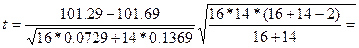 Выборки считаются равными, если расчётная величина t оказывается больше, чем (- t α), и меньше, чем (t α), т.е. находится внутри диапазона: - t α < t расч < t α. Величина t α находится по таблице для t – распределения (см. Приложение 2) при уровне значимости α и числе степеней свободы n 1 + n 2 – 2. Продолжим сравнение выборок из предыдущего примера. По таблице t-распределения при α = 0,05 и 16 + 14 – 2 = 28 степенях свободы t 0.05 = 2,048. Следовательно, критическая область определяется t < -2,048 и t >2,048. На основании данных выборок рассчитаем величину характеристики