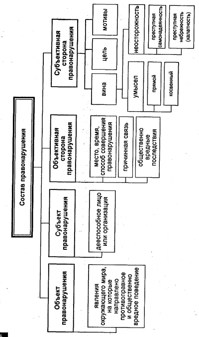Юридический состав правонарушения – это комплекс его взаимосвязанных компонентов. Он складывается из следующих составляющих: 1)субъекта; 2) субъективной стороны; 3) объективной стороны; 4) объекта. Субъект правонарушения уже нами охарактеризован. Проанализируем другие компоненты юридического состава правонарушения. Субъективная сторона охватывает три элемента: цель, мотив и вину. Цель – идеальное предвосхищение результата. Мотив – это те внутренние побуждения, которыми руководствовался правонарушитель. Сердцевиной субъективной стороны является вина. Во всех отраслях права ответственность за правонарушение базируется на признании лица виновным в совершении правонарушения, то есть на наличии в его деяниях вины. Право в цивилизованном обществе отрицает так называемое «объективное вменение», то есть ответственность за сам факт противоправного деяния при отсутствии вины лица в совершении правонарушения. Вина – это психическое отношение субъекта права к совершенному им противоправному деянию. Она подразделяется на умысел и неосторожность. Умысел означает, что лицо, совершившее правонарушение, сознавало противоправный характер своего деяния, предвидело и желало наступления его последствий или сознательно допускало их. Прямой умысел как разновидность умысла характеризуется тем, что субъект правонарушения желал наступления противоправных последствий своего деяния. Косвенный умысел не преследует цель наступления таких последствий, но сознательно допускает их. Неосторожность как разновидность вины отличается от умысла тем, что субъект правонарушения либо предвидит наступление противоправных последствий своего деяния, но вследствие легкомыслия надеется их предотвратить, либо не предвидит их, хотя мог и должен был их предвидеть. В зависимости от этого неосторожность подразделяется на самонадеянность и небрежность. Самонадеянность представляет собой такую форму неосторожности, когда субъект правонарушения проявляет легкомыслие по отношению к последствиям своего противоправного деяния. Небрежность – это форма неосторожности, которая характеризуется тем, что субъект правонарушения не предвидел наступление противоправных последствий своего деяния, хотя должен был и мог их предвидеть. Понятие умысла и неосторожности лаконично и исчерпывающим образом раскрыто и охарактеризовано нормами уголовного права. Однако его правовое содержание носит универсальный характер и фигурирует при решении вопросов, связанных с гражданско-правовой, административной и дисциплинарной ответственностью. Таким образом, субъектом правонарушения может быть лишь вменяемое лицо, то есть лицо, сознававшее противоправный характер своего деяния. Разумеется, оно должно достигнуть определенного возраста и быть способным руководить своими поступками. В гражданском, административном, налоговом и другом законодательстве им может быть не только физическое, но и юридическое лицо - учреждение, организация, предприятие и т. д. Объективная сторона правонарушения состоит из следующих элементов: 1) противоправного деяния; 2) вреда, причиненного общественным отношениям; 3) причиной связи между совершенным противоправным деянием и наступившими последствиями. Помимо указанных компонентов объективной стороны состава правонарушения след