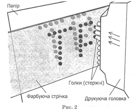 Матричні принтери найбільш «старі» за віком з тих, що нині випускаються, і коло їх застосувань з кожним роком зменшується. Матричні принтери заявилися у 1971 році, їх уперше виготовила американська фірма «Сентронікс». На кінець 70-х років минулого століття матричні принтери стали основними на ринку принтерів. Принцип дії матричного принтера зводиться до створення на носії зображення символів або графіки за допомогою окремих точок, які наносяться з використанням спеціальних стержнів (голок). Під управлінням драйвера друку стержні в певний момент часу ударяють по фарбуючий стрічці, яка розміщена в проміжку між стержнями і папером, і залишають на папері слід — точку. Сукупність розміщених у певному порядку точок і створює потрібне зображення (рис. 2).