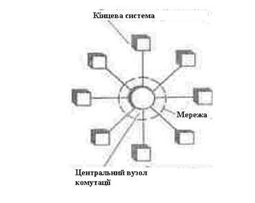 Топологія мережі визначається способом з’єднання її вузлів із каналами (кабелями) зв’язку. На практиці використовуються п’ять базових топологій: зіркоподібна, кільцева, шинна, змішана чи багатозв’язна та деревоподібна. Топологія мережі впливає на такі її показники, як надійність, розширюваність (нарощуваність), вартість, затримка і перепускна здатність. Затримка мережі - це час передачі інформаційних повідомлень між абонентами, тобто час між видачею повідомлення з абонента-джерела і його прийомом абонентом-одержувачем (адресатом). Перепускна здатність - це максимальне число бітів абонентських повідомлень, що можуть передаватися через мережу в одиницю часу. Рисунок 1. Топологія «Зірка» Зіркоподібна топологія. У мережі зі зіркоподібною топологією кожен абонент, що посилає і (чи) приймає інформацію, приєднаний одним чи двома виділеними каналами зв’язку до єдиного центрального вузла, через який проходить весь мережевий трафік. Кожен комп'ютер підключається окремим кабелем до загального пристрою, який має назву концентратор та розташовується в центрі мережі. У функції концентратора входить спрямування переданої комп'ютером інформації одному чи всім іншим комп'ютерам мережі. Головна перевага цієї топології перед спільною шиною — значна надійність. Будь-які неприємності з кабелем стосуються лише того комп'ютера, до якого цей кабель приєднаний, і лише зіпсованість концентратора може вивести з ладу цілу мережу. Крім того, концентратор може відігравати роль інтелектуального фільтра інформації, що надходить від вузлів у мережу, і за необхідності блокувати заборонені адміністратором передачі. До недоліків топології типу зірка відноситься більш висока вартість мережного устаткування через необхідність придбання концентратора. Крім того, можливості з нарощування кількості вузлів у мережі обмежуються кількістю портів концентратора. Часом має сенс будувати мережу з використанням декількох концентраторів, ієрархічно з'єднаних між собою зв'язками типу зірка В даний час ієрархічна зірка є найпоширенішим типом топології зв'язків яку локальних, так і в глобальних мережах. Кільцева топологія. У мережі з кільцевою топологією вузли підключаються до повторювачів сигналів, зв’язаних у односпрямоване кільце, чи до двох повторювачів, зв’язаних у два різноспрямованих кільця. У мережах з кільцевою конфігурацією дані передаються по колу від одного комп'ютера до іншого — як правило, в одному напрямку. Якщо комп'ютер розпізнає дані як «свої», то він копіює їх собі у внутрішній буфер. У мережі з кільцевою топологією необхідно вживати спеціальних заходів, щоб у разі виходу з ладу чи відключення якоїсь станції не перервався канал зв'язку між іншими станціями. Кільце являє собою дуже зручну конфігурацію для організації зворотного зв'язку — дані, зробивши повний оберт, повертаються до вузла-джерела. Тому цей вузол може контролювати процес доставки даних адресату. Часто ця властивість кільця використовується для тестування зв'язності мережі та пошуку вузла, що працює некоректно. Для цього в мережу посилаються спеціальні тестові повідомлення. У той час, як невеликі мережі, як правило, мають типову топологію — зірка, кільце чи спільна шина, для великих мереж характерна наявність довільних зв'язків між комп'ютерами. У таких мережах мож