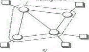 Рисунок 3. Шинна мережа Змішана топологія. Мережа зі змішаною топологією є, як правило, неповнозв’язаною мережею вузлів комутації повідомлень (пакетів), до яких приєднуються кінцеві системи. Усі канали зв’язку є виділеними двоточковими. Такого роду зв’язки найбільш часто використовуються у великомасштабній та регіональній обчислювальній мережах, але іноді вони застосовуються й у локальних обчислювальних мережах. Змішану мережу можна розглядати як зіркоподібну мережу, у якої центральний вузол має розподілену архітектуру.