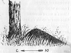 Рис. 2. Определение сторон горизонта по муравейнику Определив по компасу стороны горизонта, далее необходимо правильно ориентировать карту и найти на ней точку своего стояния. Для этого необходимо повернуть карту так, чтобы ее верх был направлен на выбранный предмет, и карта будет ориентирована. Ориентировать карту можно и другим способом. Встав, например, на дорогу (на какую-либо линию на местности), обозначенную на карте, поверните карту так, чтобы направление условного знака дороги совпало с направлением дороги на местности. Если предметы справа и слева от дороги имеют такое же расположение, как и на карте, значит карта ориентирована правильно. Перед походом нужно обязательно проверить исправность компаса. С опущенным тормозом компас устанавливается в горизонтальном положении. К стрелке подносят какой-либо стальной предмет, выводят ее из равновесия и проверяют, вернется ли она на прежний отсчет. Если стрелка не установится в постоянное свое положение, значит компас неисправен, пользоваться им нельзя. Но и исправный компас может неправильно указывать стороны горизонта. Случается это во время грозы, рядом с линиями электропередач, электрифицированных железных дорог. Из многих способов определения сторон горизонта наиболее популярными считаются следующие. По муравейникам (рис. 2.). Они располагаются к югу от пней, кустов и деревьев. Южная сторона муравейника всегда пологая. По мхам и лишайникам. Они растут с северной стороны ствола одиноко стоящего дерева. Зимой по лункам у деревьев, где снег быстрее оттаивает с южной стороны. Но в оврагах, канавах и ямах снег быстрее подтаивает с северной стороны. Созревающие ягоды и фрукты окрашены ярче с южной стороны. Все эти способы подтверждены практикой, однако, помогают определять стороны горизонта лишь приблизительно и их всегда нужно проверять. На водном пути свое местонахождение можно определить по населенным пунктам, по видимым дорогам, устьям притоков, островам, характерным участкам берегов рек. Когда туристский маршрут пролегает по незнакомой местности, в стороне от дорог и троп, движение осуществляется по азимуту. Азимут - это угол, который отсчитывается по ходу часовой стрелки от северного направления меридиана до направления движения. Научиться ходить по азимуту несложно, но для этого требуется определенный опыт. Поэтому накануне похода руководитель должен ознакомить всех участников с основами движения по азимуту, а уже в походе нужно попрактиковаться в хождении в различных условиях. В походе никогда не бывает прямолинейного пути. Встретятся болотистые места, питомники, просеки, огороженные заповедники и т. д. Здесь уже нельзя выдержать взятый азимут. Если на пути возникнут такие препятствия, к желанной "точке" придется двигаться в обход. Бывает и так. Турист идет по степной целине или по полю, где нет дороги, ему нужно выйти к реке. Турист, хорошо ориентирующийся на местности, без труда укажет направление к ней. Найти реку нетрудно: местность по направлению к реке понижается, к реке тянутся заросшие балки, овраги, к ней текут ручьи, В походах туристов-водников ориентирование также не сложно. Оно требуется в местах с сильно изрезанной береговой линией или в случаях затерявшегося выхода реки из озера. Водникам помогают береговые плавучие знаки, указатели фарватера рек