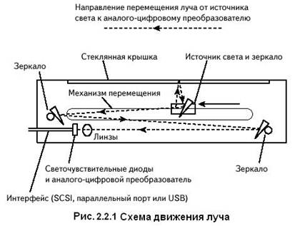Луч света падает на оригинал, отражается от него и через систему зеркал попадает на светочувствительные диоды, где преобразуется в электрический сигнал. Этот сигнал поступает на аналого-цифровой и преобразователь, где конвертируется в сигнал, представляющий собой пиксели оригинала (черные, белые, оттенки серого или цветные). Эта цифровая информация передается в компьютер для дальнейшей обработки.
